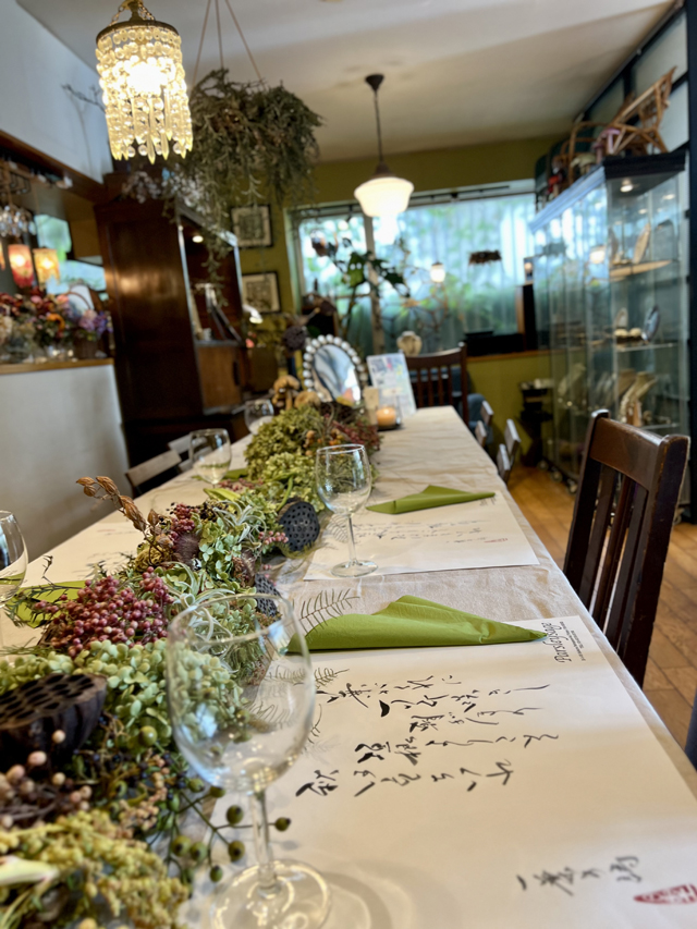 パセリセージのお料理レッスンでは、作り方をデモンストレーションで学び、お飲み物がつきフルコースで祐子先生の作るお料理を参加の皆さん、おしゃべりしながら楽しくいただます。初めての方もぜひ一度ご参加ください。そしてメニューレシピとお土産がつく贅沢なレッスンです。テーブルはパセリセージの三上星美が秋をイメージしてコーディネート致します。