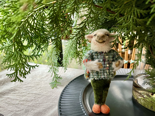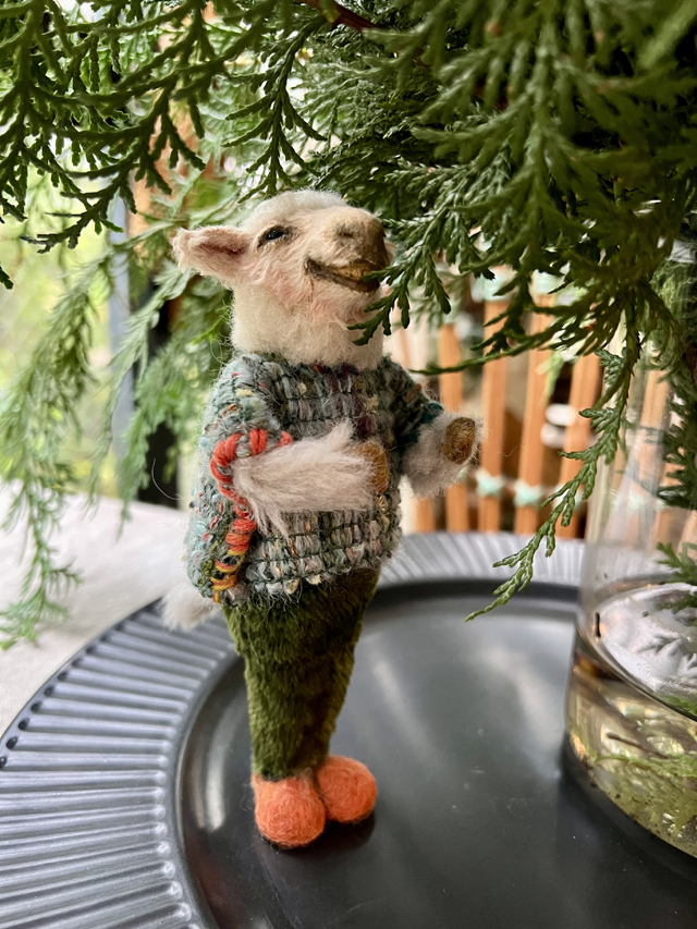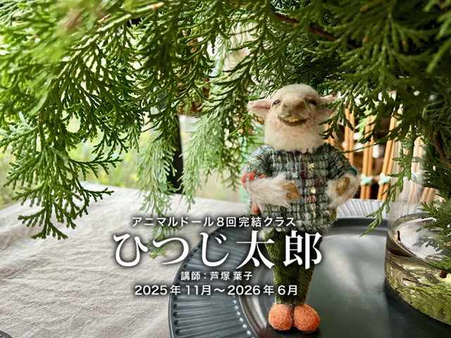 この11月から来年6月までの8回レッスンで仕上げるアニマルドールの教材は「ひつじ太郎」です。 前回に引き続き、今回も洋服を着ている風のアニマルドール。 モチーフ動物は羊です。 「ひつじ太郎」はちょっと寒がりなおじさん羊。草が大好物なのでパンツは草色。毛刈りシーズン後でお腹が冷えるのでツイード生地の上着にインナーも着込んでいる…という設定ですが、若いイケメン羊にするのも作る方のイメージ次第。 今回の教材も粘土ベースは顔のカタチもほぼできている状態なので初めての方も大丈夫です。「ひつじ太郎」の草色パンツにはアンティーク素材を使用しています。 またツイード風の上着は四角い布に穴をあけた貫頭衣というカタチでフチをまつるだけなのでお裁縫が苦手な方でも心配ご無用です。 お道具はご用意してありますので、手ぶらで気軽にご参加ください。 あなたのお部屋のインテリアともきっと馴染む、「ひつじ太郎」を作ってお部屋に飾ってみませんか。
