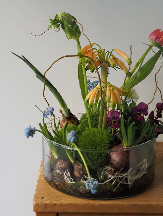 ガラス花器に敷き詰めたハイゴケに春らしい球根をアレンジしていきますアレンジしたものはそのまま飾っていただけるだけでなく、ご自宅で分けてお好きな場所に飾っていただくこともできます。球根の個体差もございますが、土に植えるとまた翌年お花が咲くものもありますので長く楽しんでいただける内容になっています。ガラス花器(直径22cm高さ10cm)も色々な場面でご使用いただけます。(花材は多少変わる場合もございます)