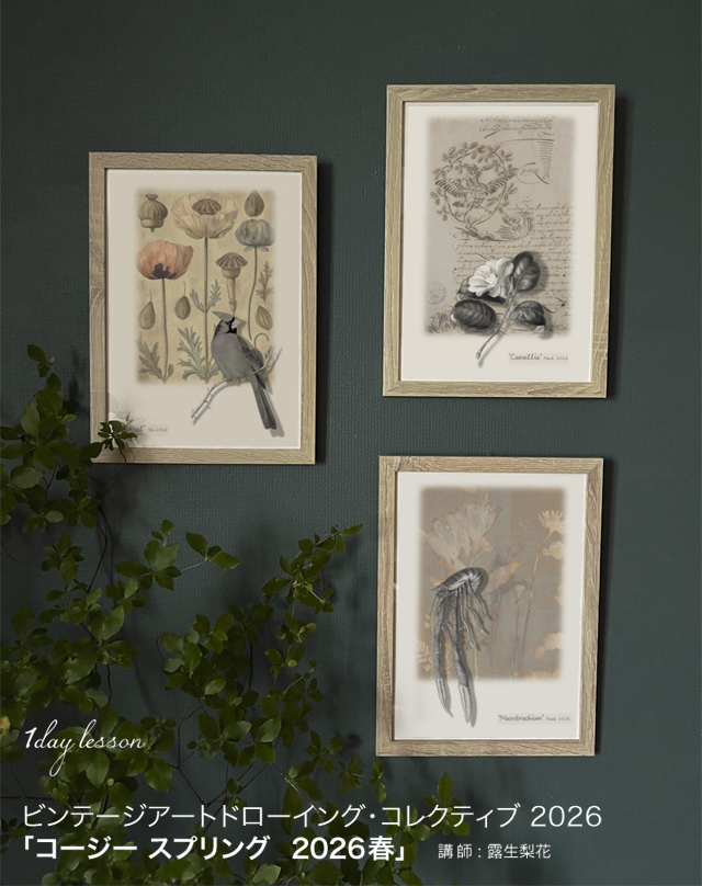 来る2、3、4月は一年の始まりを迎えるにあたりスタートダッシュではなく、スローでコージーなテキストをご用意しました。2月テキストはカーディナル、3月は可憐なカメリアをビンテージな雰囲気で、そして4月はなんと手長エビです。それぞれの特徴を捉えつつモチーフをビンテージアートの背景の中に鉛筆ドローイングで仕上げるワンデイレッスンです。今回も、私たちの生活の中に日常映えする優しい色味の背景の中、4〜5色の濃度の異なる鉛筆を効果的に使い分けながら描写します。これまでと同様にお好きなモチーフを見つけて、奮ってご参加ください。