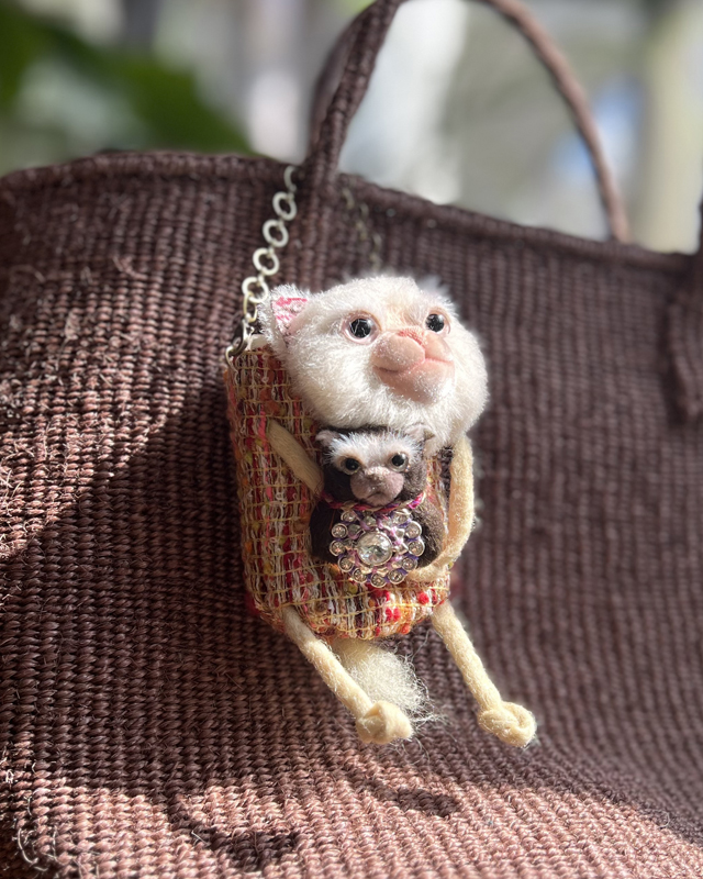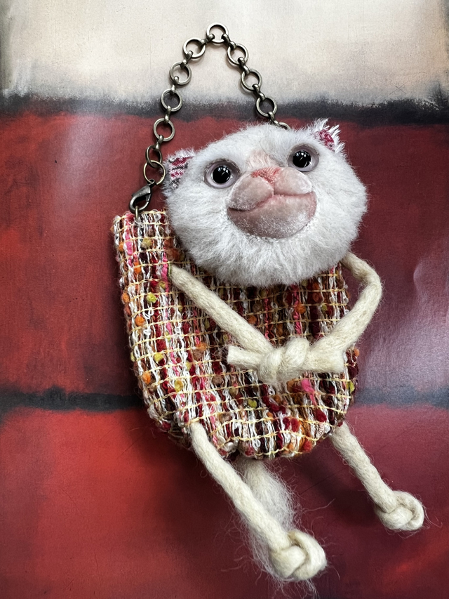 春のアニマルドール1dayレッスンPart1のモチーフ動物は猫。 白猫の毛は真っ白でとても綺麗ですが、今回はお外で暮らす少しくすんだ毛色の白猫がモチーフです。おウチはないけど、生きる知恵をたくさん持っていて自由を楽しんで暮らしている猫のイメージです。 レッスンで作るのはブローチ部分。胴体部分にあたる袋部分は出来ているものをご用意します。 キットでは中にペーパーハンカチを入れてありますが、エコバッグなどをクルッと丸めて入れられるサイズです。 完成したブローチをつけてバッグに下げると猫のチャームになります。 半完成キットでご用意しますので、初めての方でも完成してお持ち帰りいただけます。どうぞお気軽にご参加ください。